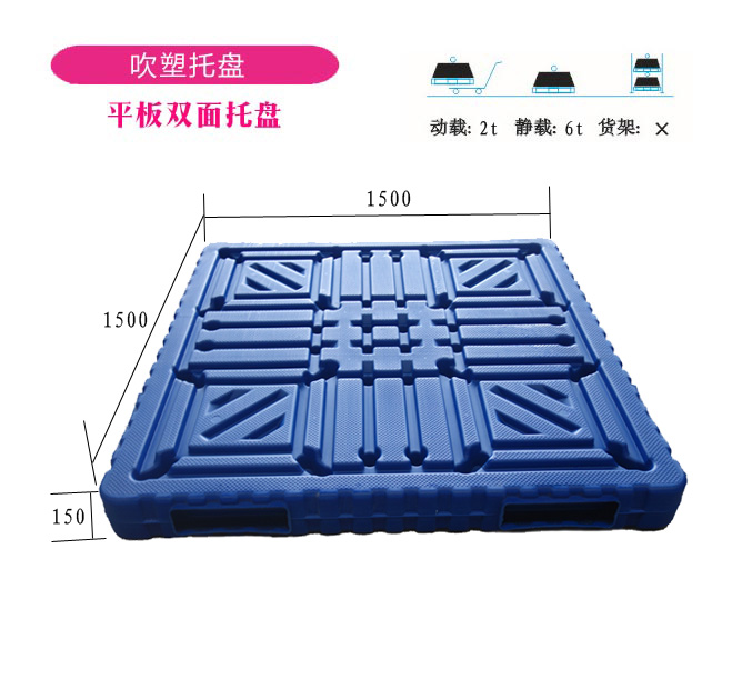 雙面吹塑托盤特點: 1、吹塑一體成型,隔墻離地存放時不會潮濕,方便清洗,不給微生物和其他蟲害提供滋生的溫床,更適合食品、醫(yī)藥、煙草、化工等要求嚴(yán)格的行業(yè),為您的嚴(yán)格把控提供方便。 2、采用高分子量高密度聚乙烯(HMWHDPE)作為原料,優(yōu)于普通低壓聚乙烯(HDPE)。 3、吹塑托盤優(yōu)勢表面光滑平整無毛刺,邊角為弧度角,不會刮傷或磕碰您的產(chǎn)品,讓您使用更安心。 4、吹塑產(chǎn)品不易破裂情況,無料屑、粉粒和雜質(zhì),為您的產(chǎn)品安全保駕護航。 5、載重大:動載1-1.5t,靜載2-4t,是原來普通塑料托盤的數(shù)倍。 吹塑托盤的優(yōu)勢: 1、吹塑托盤承載大,動載達(dá)到2噸以上。 2、吹塑托盤使用壽命長,正常使用壽命在8年以上。 3、吹塑托盤抗摔性能強,三米對角跌落無破損。 4、吹塑托盤質(zhì)軟,韌性好,被叉車撞擊后不會產(chǎn)生飛邊或掉塊。 5、吹塑托盤結(jié)構(gòu)設(shè)計合理,表面為凹槽設(shè)計,防滑性好,無邊角余料。 6、吹塑托盤安全性能好,不助燃、不導(dǎo)電、不產(chǎn)生靜電、無毛刺飛邊。 7、吹塑托盤化學(xué)穩(wěn)定性好,無毒無味,耐酸堿鹽的腐蝕,易于清洗消毒,不腐爛。 8、吹塑托盤環(huán)保性能好,可回收再利用。